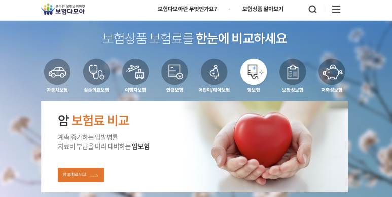 금융위원회와 보험협회가 운영하는 온라인 보험슈퍼마켓 ‘보험다모아’입니다.