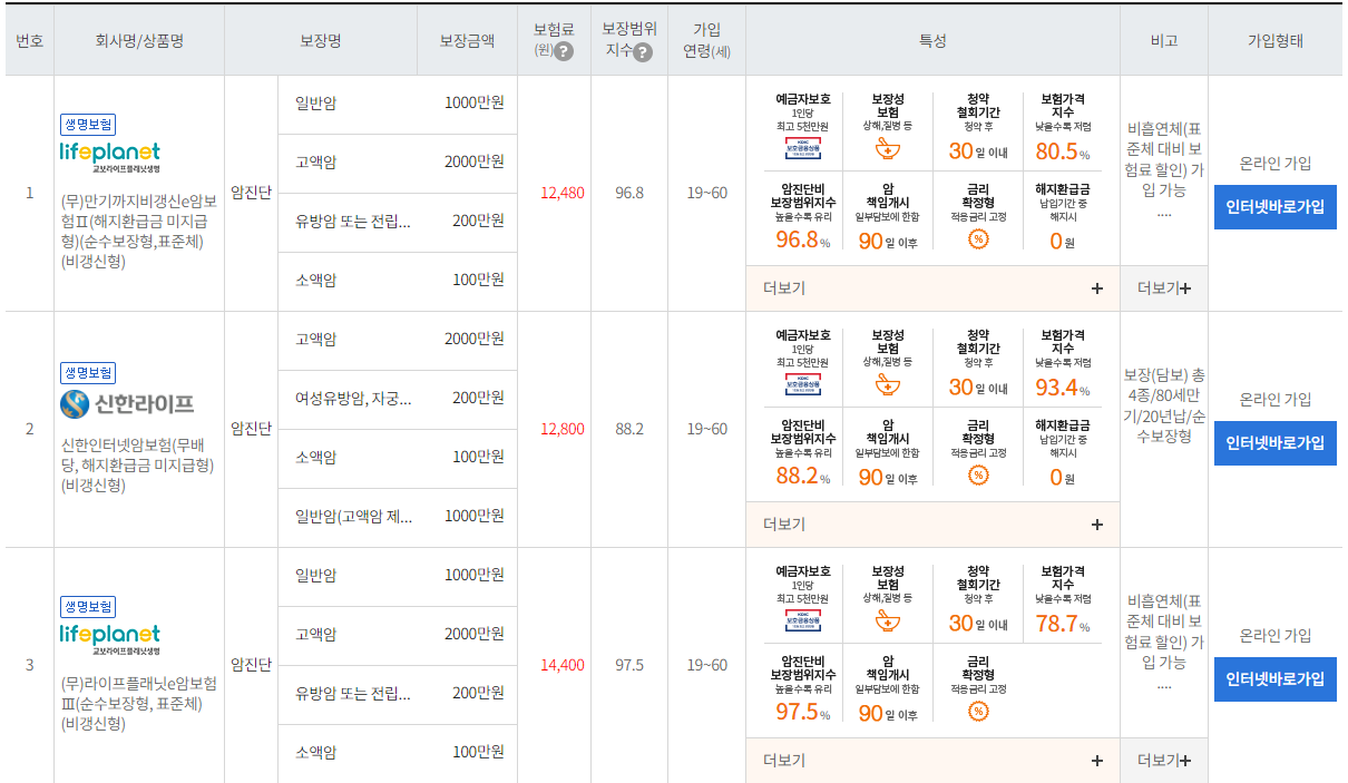 다만, 보험료만 봐서는 비교분석이 안되며, 옆에 보면 보험가격지수라는게 있습니다. 이 지수가 낮을 수록 나한테 유리하다는 정보입니다. 3개 중에는 신한라이프 93.4%로 가장 좋네요.