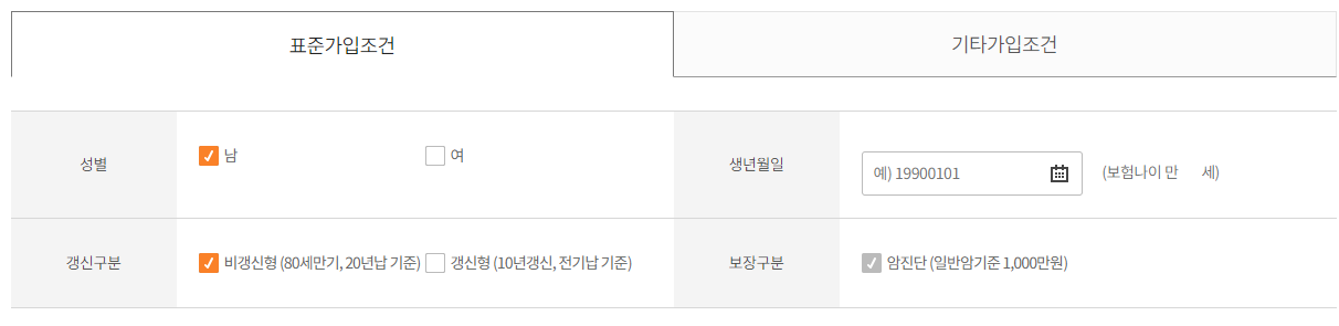 그리고, 표준가입조건, 기타가입조건 TAB을 클릭해서 비교해 볼 수 있습니다. 표준가입은 암진단(1천만원)에 대해서만, 기타가입은 암진단/필수가입담보 뿐만 아니라, 암입원, 기타담보도 체크해서 비교가능합니다.
