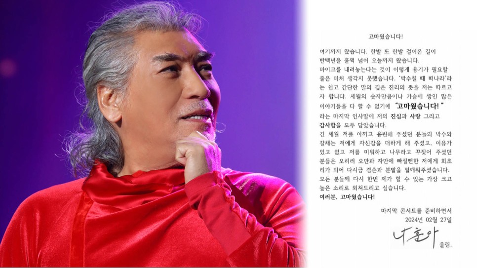 나훈아의 은퇴 선언과 함께 소속사를 통해 전달된 '고마웠습니다' 편지가 공개되었습니다. 이 편지에서 나훈아는 "박수칠 때 떠나겠다는 말의 깊은 진리를 따르고자 한다"며 은퇴를 결정했다고 밝혔습니다.