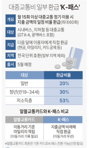 K-패스는 시내·마을버스, 지하철, 광역버스, 그리고 광역급행철도(GTX)를 이용할 때 발생하는 비용의 특정 비율을 환급해주는 서비스입니다. 이는 일반인의 경우에는 20%, 청년층은 30%, 저소득층은 53%의 비율로 환급됩니다.