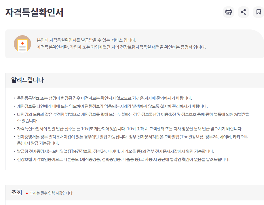 - 로그인 후 '자격득실확인서 발급' 메뉴에서 바로 출력 가능합니다.