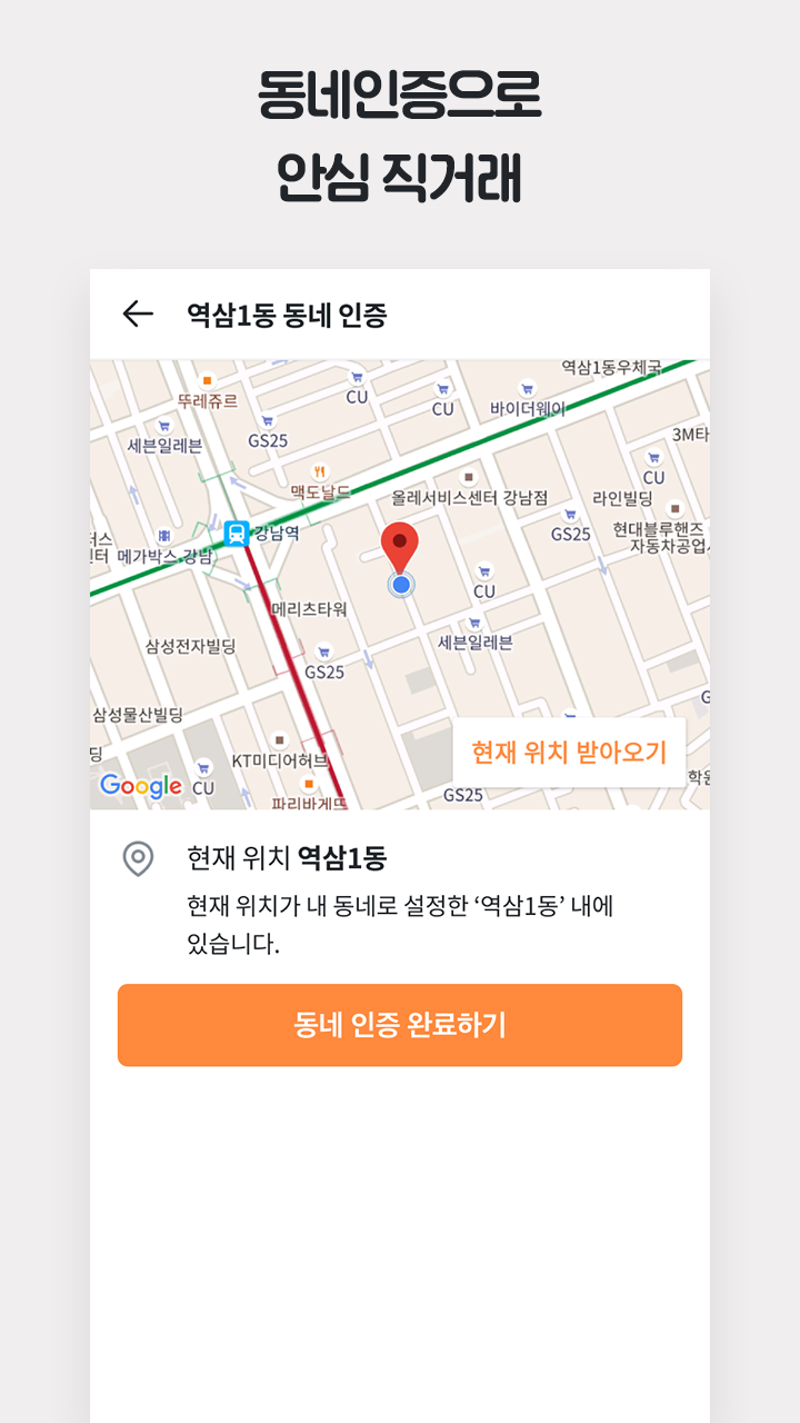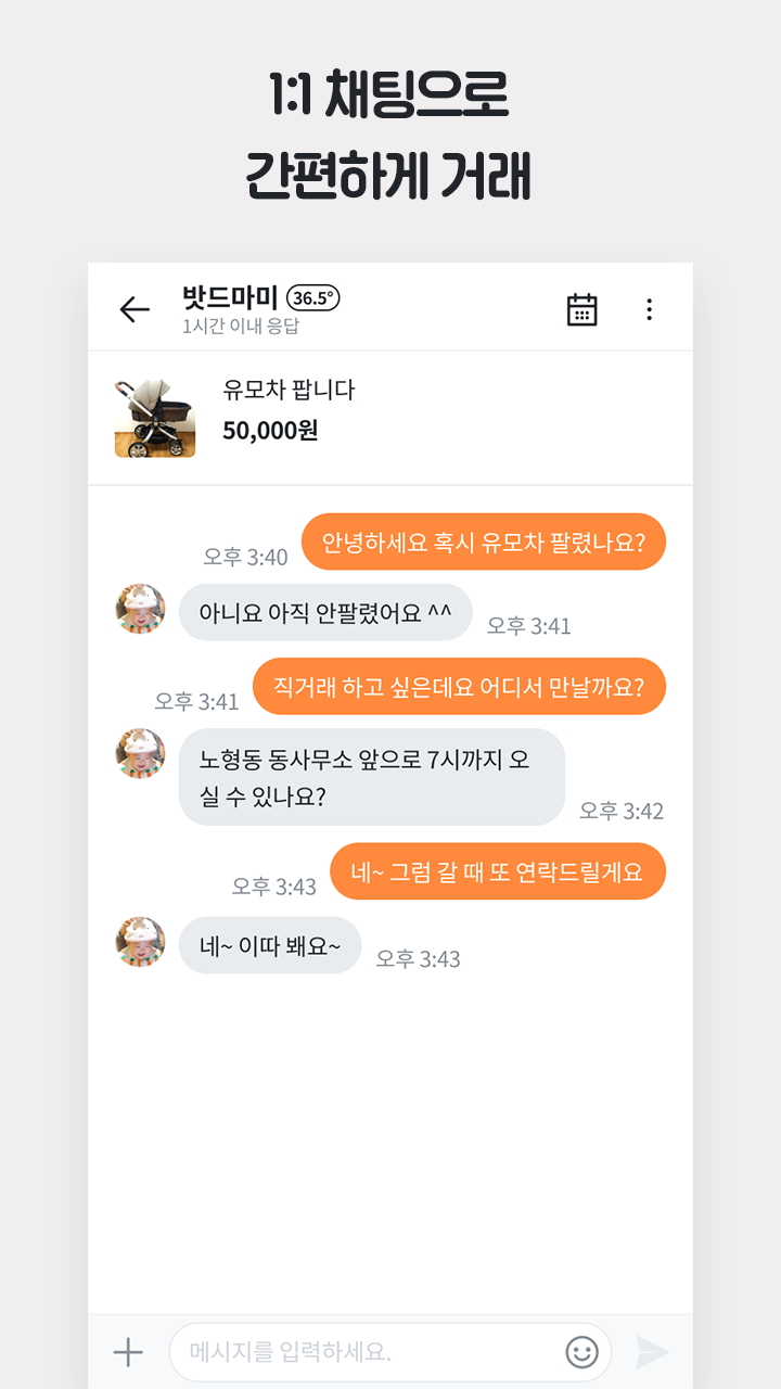 설치 후에 간단하게 동네 인증을 해요. 그 다음 우리 동네에 보이는 물건들을 구경하고, 그 물건을 판매하는 사람과 1:1 채팅을 통해 거래약속을 하실 수 있어요! 물론 내가 우리 동네에 물건을 올려서 판매하실 수도 있답니다!