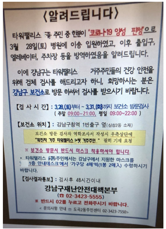 지역 주민들의 불안감도 커져가고 있다. 청와대 게시판에 지난 2일 게시된 '강남구청의 코로나19 전염병 확산에 대한 개선 요구 및 확진자와 방역에 관한 정보공개청구' 청원에는 이날까지 3670명이 참여했다. 청원인은 "강남구 확진자나 타지역의 강남구 이동동선은 다른 구의 알림이나 기사를 통해 지도를 찾으며 스무고개하는 식으로 알 수 있다"며 "국민이 선제적으로 대처할 수 있는 정도의 정보공개를 청구한다"고 했다. 구청 게시판에도 "확진자 동선 공개가 애매모호해 무슨 편지나 소설을 읽는 기분"이라며 정확한 정보 공개를 요구하는 게시물이 다수 올라왔다. 집값 떨어진다고 역시나 이번도 쉬쉬하네요.