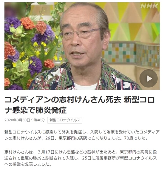 신종 코로나바이러스 감염증(코로나19) 확진 판정 후 치료중이던 일본 유명 남성 코미디언인 시무라켄(志村けん)이 29일 오후 11시 10분 입원중이던 동경 도내 병원에서 사망했다. 지난 23일 확진 판정 이후 엿새만이다. 향년 70세