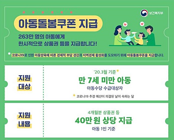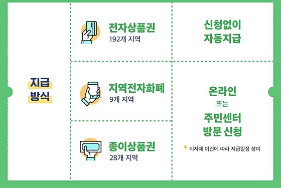 지역별로 전자상품권이나 종이상품권으로 지급예정이며 서울시의 경우 아이행복카드에 바우처 형식으로 지급된다고하니 아주 편하죠.