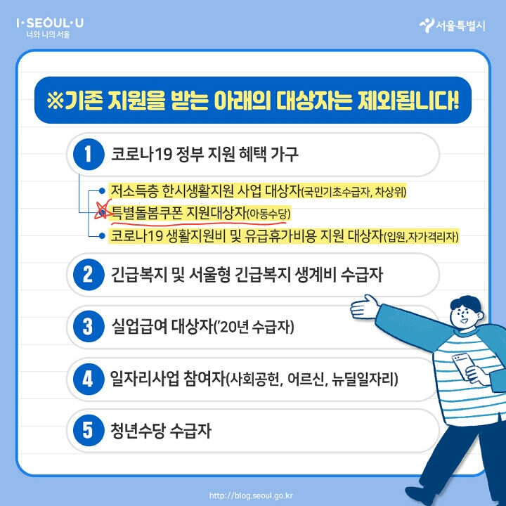 따라서 서울시에 거주중인 8세 이상 아동이 있는 가구, 임산부등은 재난 긴급생활비를 소득에 따라 신청하시고 7세 이하 아동이 있는 가구는 아동돌봄쿠폰으로 지원이 되서 재난긴급생활비를 신청할 필요가 없습니다.