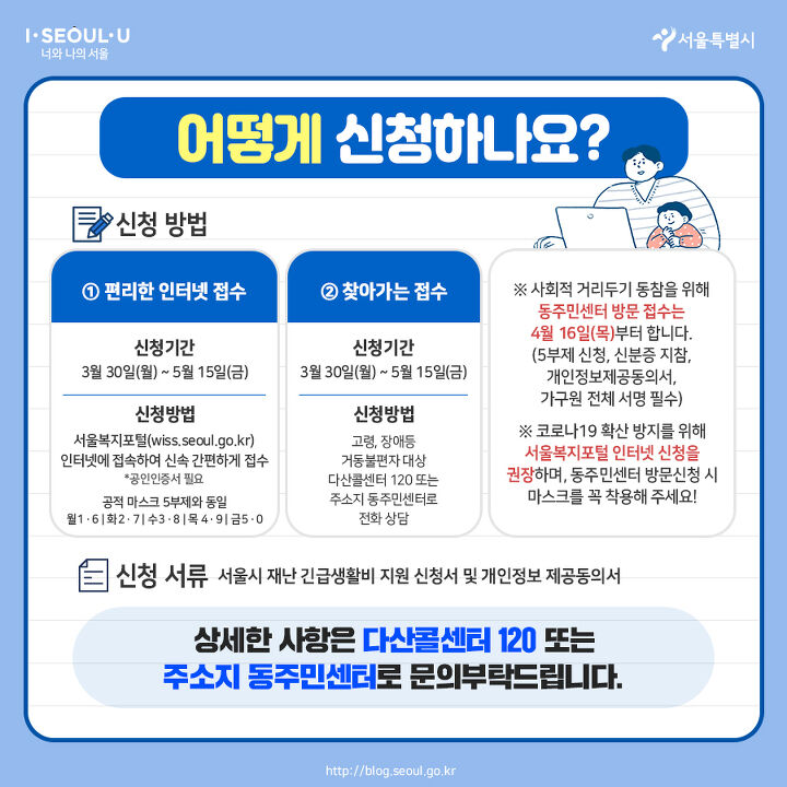 신청은 직접 주민센터 방문 또는 인터넷 사이트에서 가능합니다. 오늘부터 신청인데 동사무소는 많이 밀리고 접촉이 많이 생길것 같아서 패스. 가능하면 인터넷 사이트에서 신청하는게 편하겠어요.