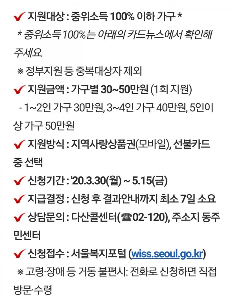 우선 재난긴급생활비는 서울시 거주 중위소득 100%이하 가구라면 누구나 신청가능합니다!