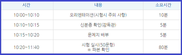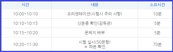 | 시험 시간 | 오전 10시 ~ 약 70분 | 시험 시작 30분 전 입실 필수 |