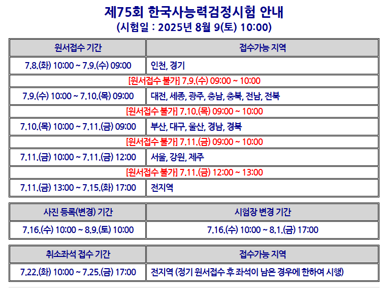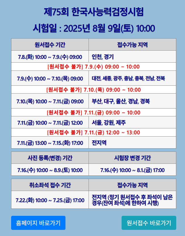 2025년 한국사능력검정시험은 보통 연 5회 이상 시행되며, 인천과 경기지역 시험 일정도 공식 홈페이지에서 공지됩니다. 각 시험일은 대체로 3~4개월 간격으로 배정되어 있으며, 원서 접수 기간과 합격자 발표 일정도 함께 안내됩니다.