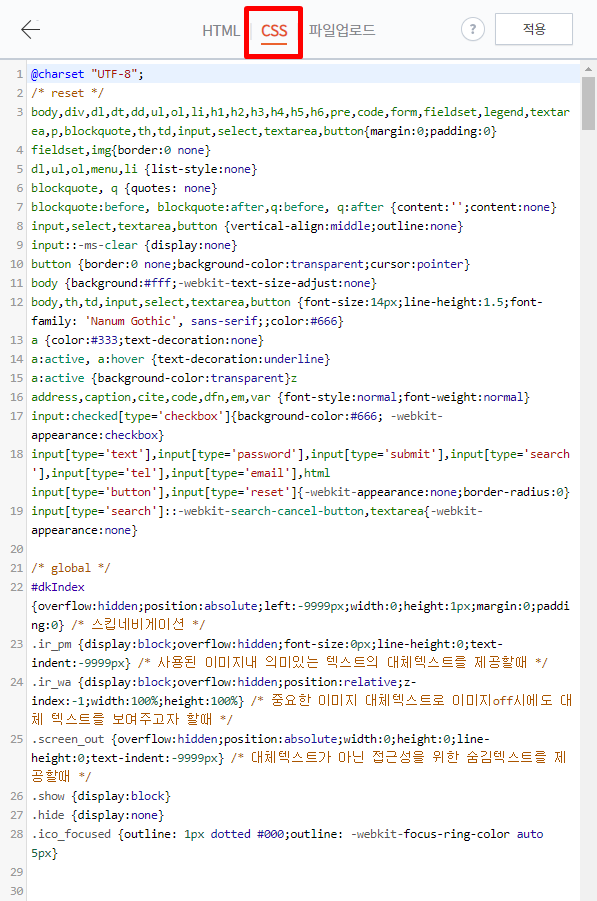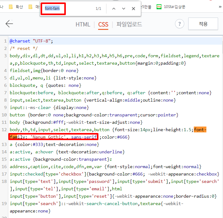 그리고 하나더 추가해 주세요. CSS 코너에 가서 font-family 라고 적혀있는 부분을 찾으세요. 쉽게 컨트롤 F 눌러서 font-family 검색하면 바로 나와요.