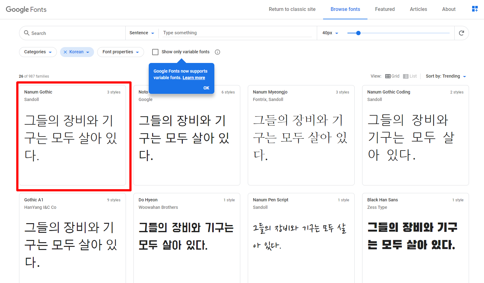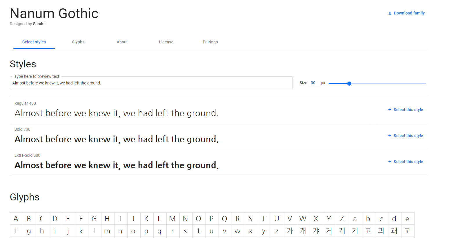 구글에서 제공하는 한국어 폰트 상당히 많습니다. 한국어에서 Nanum Gothic을 찾았다면 클릭하고 들어오세요.