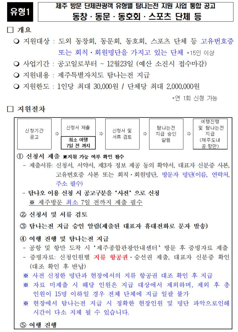 | 제주 도착 시 증빙자료 제출 | 항공권, 승선권, 대표자 신분증 등 제출 | 미제출 시 지원 제외 |