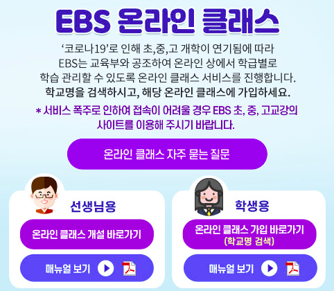 담임선생님이 구성한 강의로 클래스를 구성하고 커뮤니티에서는 반친구들과 이야기 할 수 있습니다. 자녀들의 반 수업이 준비되어 있는지 확인해 보세요. EBS온라인 클래스는 초, 중, 고 선생님들이 개설합니다. 학생들은 가입 후 선생님의 승인을 통해 클래스로 입장이 가능합니다. 말그대로 온라인 클래스, 저희 학창시절 다모임이 생각나는 분 있으시죠? 하지만 담임 선생님이 계시기 때문에 재미 노!!