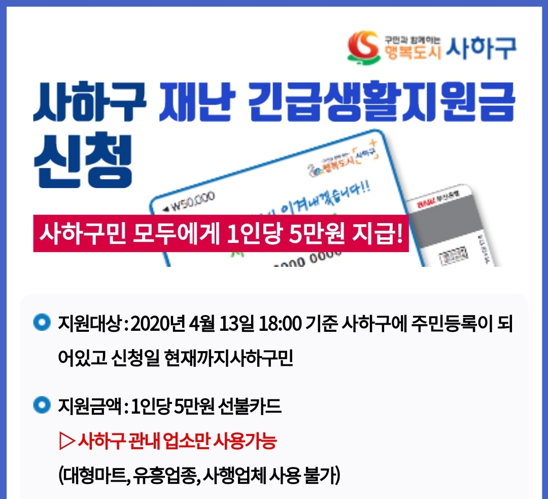 부산시·부산은행 긴급재난지원금 선불카드 발행 협약 연합뉴스 2020.05.13.부산시와 부산은행이 전 국민 긴급재난지원금 수령에 필요한 선불카드 발행에 힘을 모으기로 했다. 부산시와 부산은행은 13일 '전 국민 긴급재난지원금 지급을 위한 '#힘내자 부산! 선불카드 발행' 업무협약을 맺었다....