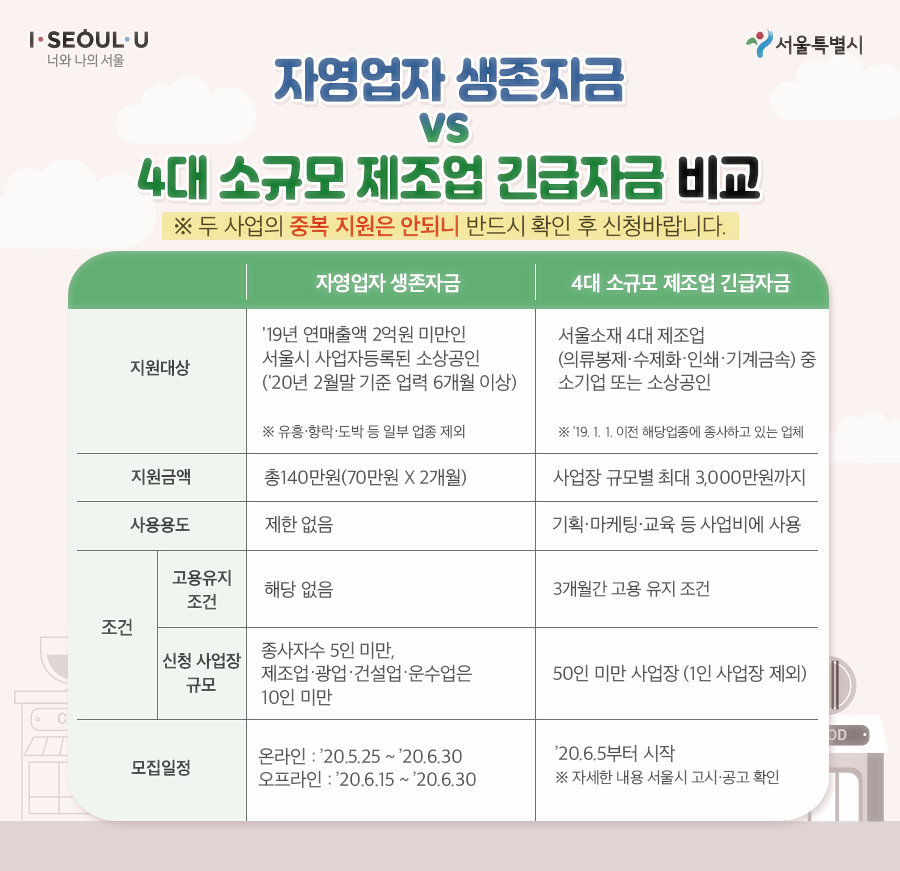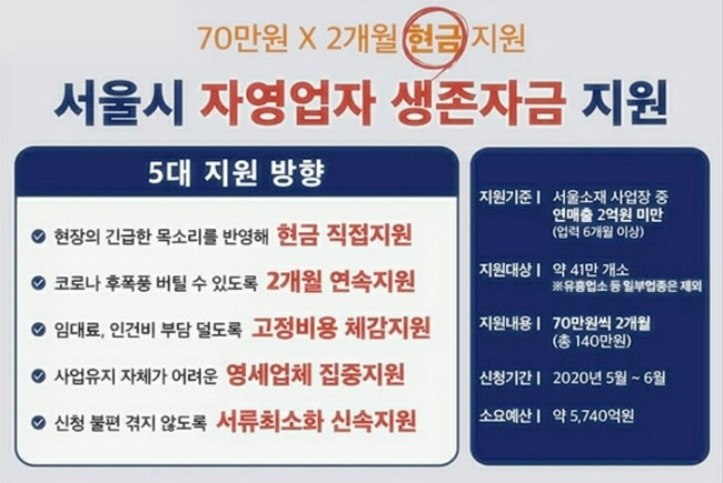 자영업자 생존자금은 지난해 연매출 2억원 미만, 2월 말 기준 서울에 6개월 이상 사업자등록을 둔 자영업자와 소상공인에게 현금으로 70만원씩 2개월간 총 140만원을 지원하는 정책이다.