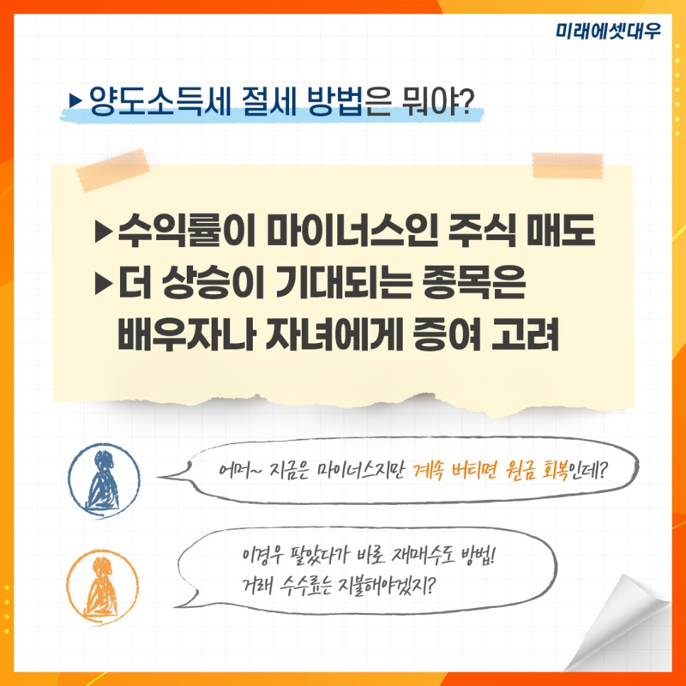 가장 일반적으로 사용할 수 있는 개인의 절세 방법은 이익이 난 종목을 매도해서 매도이익이 있는 경우, 손실이 난 종목을 동일한 해에 매도해서 매도차익을 줄이는 것이다.