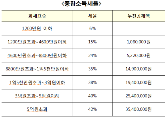 예를들어 금융소득을 제외한 근로소득이 1억 원인 A가 있는데, 미국에서 수령한 배당금을 포함하여 금융소득이 3,000만원이라면, 2,000만원을 초과한 1,000만원에 대해서는 추가적인 세금을 내야 하는데 근로소득과 합산하여 누진세율을 적용받기 때문에 종합소득세율 기준에 따라 세율이 35%가 된다.