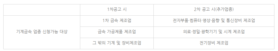 ○ 기계금속 업종은 당초 1차공고 시 지원가능했던 업종에 “전자부품·컴퓨터·영상·음향 및 통신장비 제조업, 의료·정밀·광학기기 및 시계 제조업, 전기장비 제조업”을 포함하여 지원대상 업종이 한층 확대되었다.