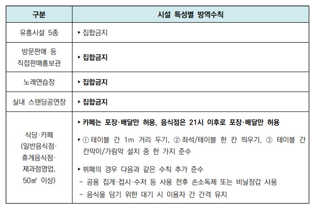 노래연습장, 직접판매 홍보관, 스탠딩 공연장처럼 실내에 사람이 모이는 곳들은 문을 닫아야 합니다.