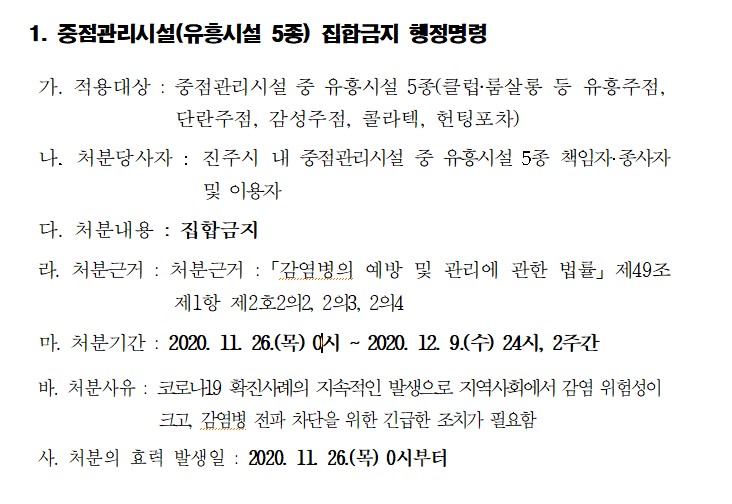 이전에는 유흥업소 5종만 닫았는데 노래연습장이라든지, 요새 또 실내 체육시설에서 감염이 많이 발생하고 있습니다. 실내 체육시설이라든지 학원이라든지 이런 부분을 추가해서 집합 금지를 하게 되는 것이다.