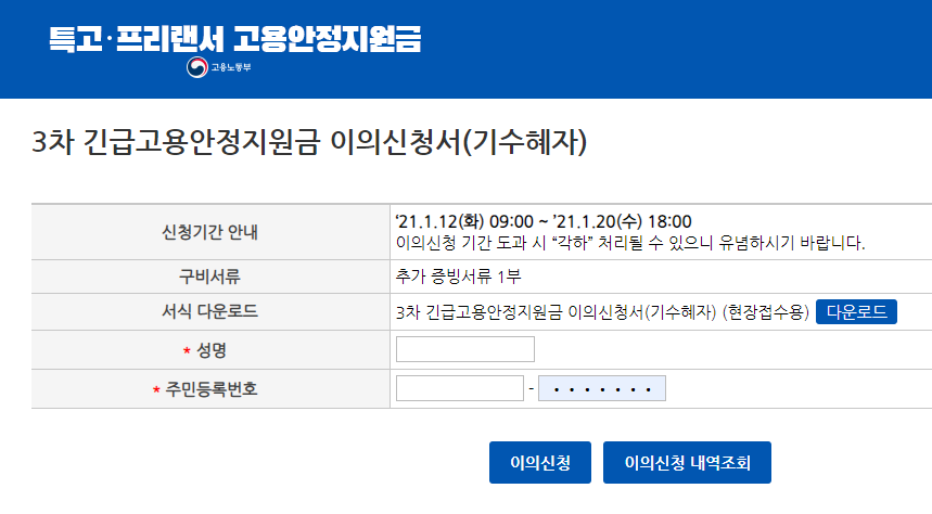 - 이의신청서(신청홈페이지에서 다운로드 가능)와 증빙서류를 신청홈페이지(covid19.ei.go.kr) 이의신청 게시판(1.12 오픈 예정)에 제출