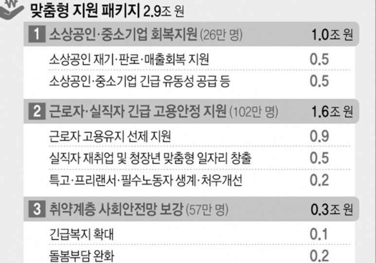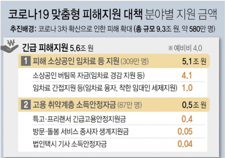 피해 소상공인 및 고용 취약계층 긴급 피해지원 (규모 : 5.6조) 내용입니다. 맞춤형 피해지원 대책 중에서도 긴급 피해지원에는 1. 피해 소상공인 임차료 등 지원 (규모 5.1조) 2. 고용 취약계층 소득안정자금 (규모 0.5조) 등의 방안이 있었습니다.