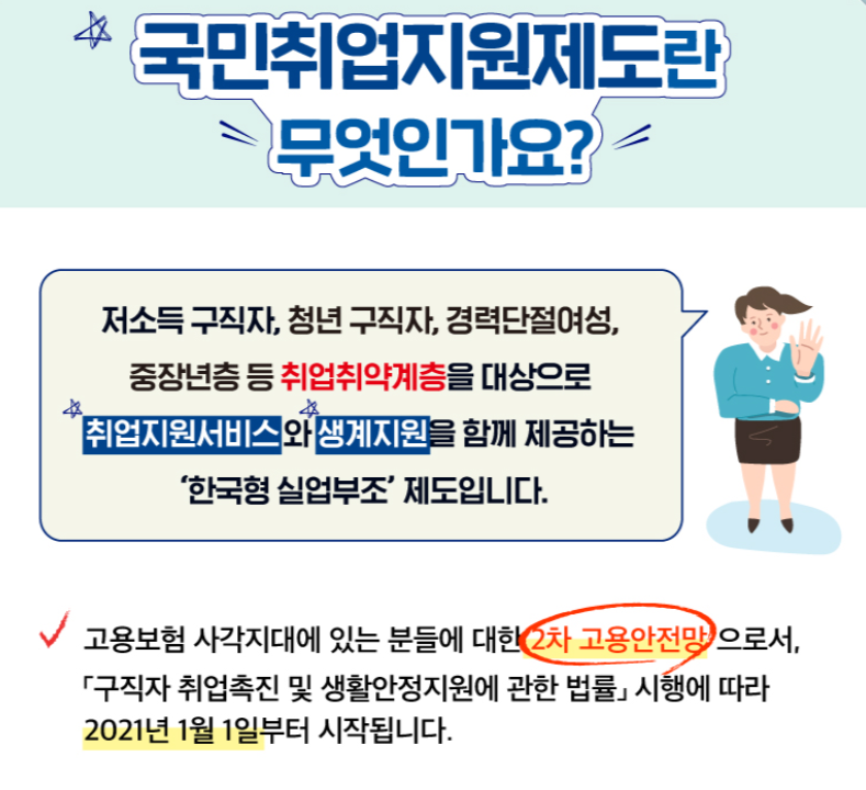 저소득층,청년,영세 자영업자,특고,프리랜스 등 취업취약계층(고용보험사각지대계층) 취업지원 서비스를 제공 하며 저소득층 구직자에는 생계 안정을 위한 소득지원 결합역시 지원되는 제도입니다