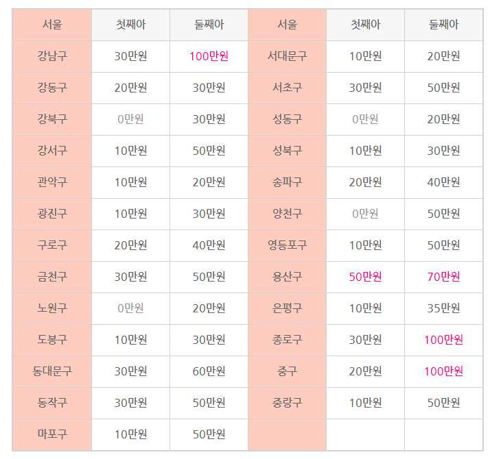 서울시 25개 자치구 중에서 첫째아 출산지원금을 지급하지 않는 서울 자치구는 6곳 (강북구 노원구 성동구 송파구 양천구) 10만원 10곳, 20만원 2곳, 30만원 6곳, 50만원 1곳입니다. 둘째아 서울시출산지원금은 종로구와 중구, 강남구가 100만원으로 가장 많은 출산혜택을 지원합니다.