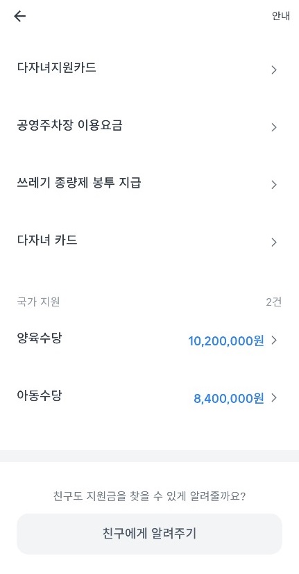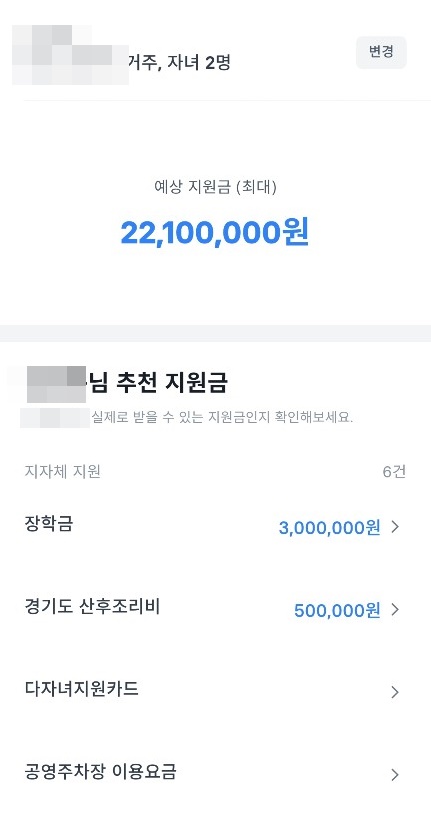 내용을 확인해보니 자녀와 관련된 지원금도 확인 할 수 있습니다. 개인정보를 사용해서 숨어있는 정부지원금을 찾아주는 것은 아닌것으로 보입니다.