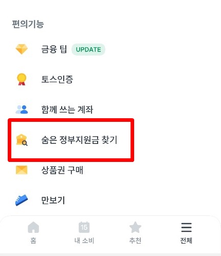 토스 앱으로 접속하시면 삼지창 전체메뉴 클릭하고 편의기능 - 숨은 정부지원금 찾기 메뉴가 있습니다.