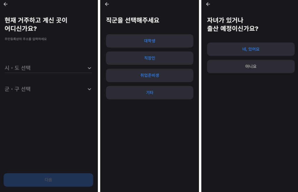 현재 거주지에 따라 정책들이 적용받을 수 있는 혜택들이 다를 수 있으니 순서에 따라 개인정보를 넣어 줍니다.