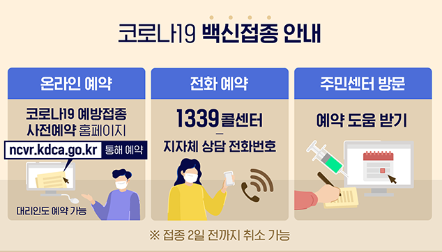 접종 예약은 '코로나19 예방접종 사전예약 시스템' 온라인 페이지와, 질병청ㆍ지자체 콜센터에서 신청할 수 있습니다.