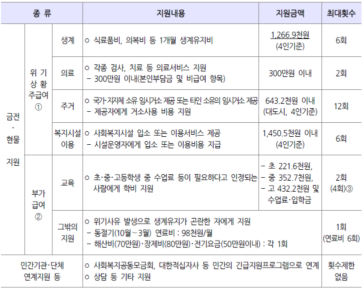 생계비는 가구원 수에 따라 30만 원부터 최대 100만 원까지 지원한다. 주거비 및 의료비는 가구원 수 구분 없이 각각 최대 100만 원까지 지원하며, 기타 교육비, 연료비, 전기요금 등을 지원한다.