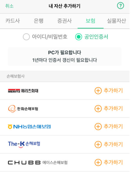앱을 다운받고, 최초 1회 공인인증서 연동을 하거나 각 보험사 아이디/패스워드로 로그인을 하면 내가 가지고 있는 보험 목록이 나타납니다.