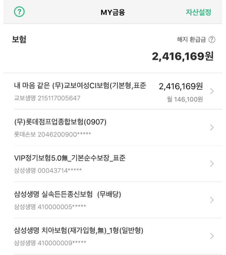 보험사는 각기 다르지만 한꺼번에 확인해볼 수 있다. 여러 앱 들락날락 할 필요 없이 정리가 깔끔하다. 각 상품의 보험사와 보험이름, 해지환급금까지 알 수 있다. 앞으로는 내가 무슨 보험을 가지고 있는지 잊어버릴 일 없게 뱅크샐러드만 꾸준히 확인하면 되겠다.!!!