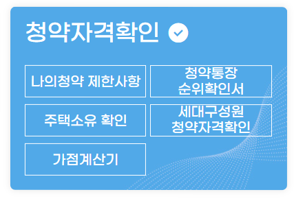 청약신청 APT 특별공급 1순위/2순위 무순위/잔여세대 취소후재공급 청약신청 내역조회 청약취소 오피스텔/도시형생활주택/민간임대 청약신청 청약신청 내역조회 청약취소 공공지원민간임대 청약신청 청약신청 내역조회 청약취소 민간사전청약 분양정보/경쟁률 청약신청 청약신청 내역조회 청약취소 당첨조회 사전청약
