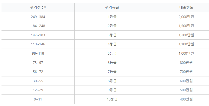 최고 2천만원 한도 내에서 '햇살론 소상공인 평가표'에 의해 평가된 점수별 평가등급에 따라 대출한도가 달라집니다.